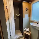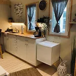 Rummen på stället har vattenkokare, kylskåp och köksredskap tillsammans med separat toalett och dusch.
